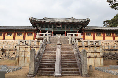 Seokguram Grotto was established in the 8th century CE under the auspices of the Silla Kingdom. It is a man-made cave that consists of a monumental statue of the Buddha facing towards the sea. Surrounding the statue are other Buddhist wall sculptures portraying Bodhisattvas, deities, and disciples. The nearby Bulguksa Temple was built a little later in 774CE. The temple complex comprises a set of wooden religious buildings erected on raised stone terraces. Together, they are representative of Korean religious art-form from that era.
